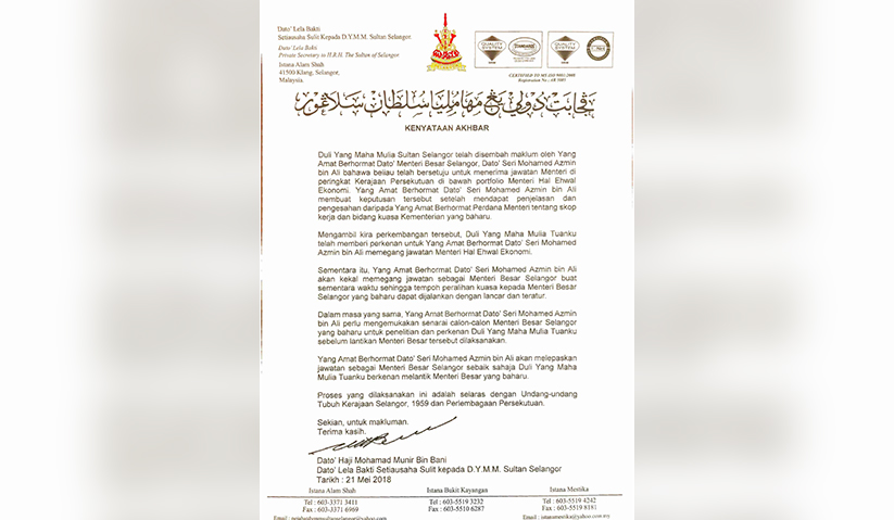 Jelas kenyataan itu lagi, Azmin akan melepaskan jawatan sebagai Menteri Besar Selangor sebaik Sultan Selangor berkenan melantik Menteri Besar yang baharu.