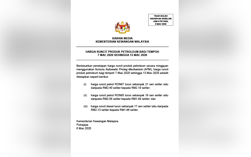 Kementerian Kewangan berkata ia berdasarkan penetapan harga runcit produk petroleum secara mingguan menggunakan formula Mekanisme Harga Automatik (APM).
