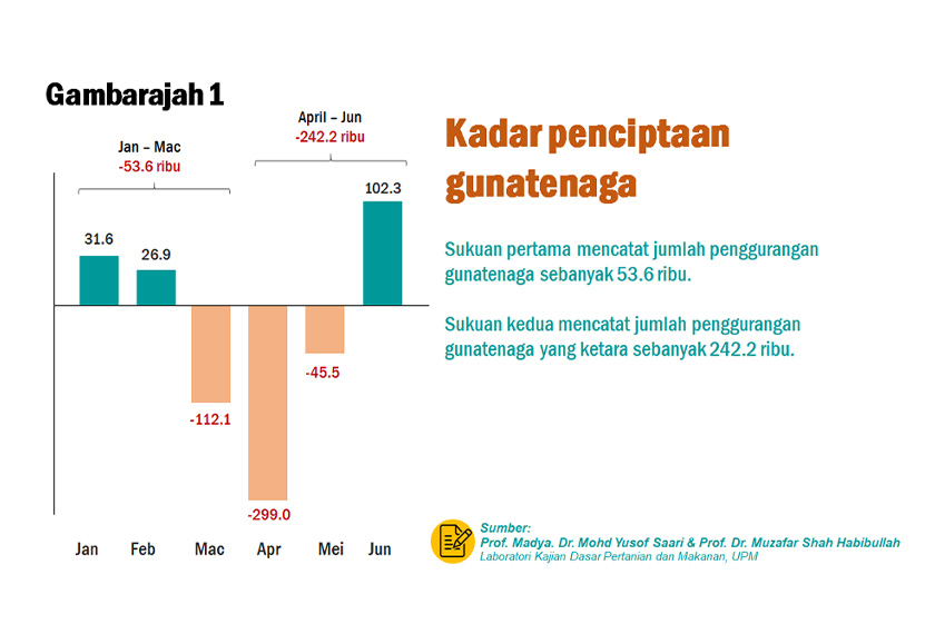 Sukuan pertama (Januari - Mac) menunjukkan penggurangan penciptaan gunatenaga sebanyak 53.6 ribu orang akibat daripada kehilangan pekerjaan yang ketara pada bulan Mac. Situasi sukuan kedua (April - Jun) bertambah buruk dengan penggurangan gunatenaga sebanyak 242.2 ribu orang akibat daripada kehilangan pekerjaan yang ketara pada bulan April. Walaubagaimanapun, kadar kehilangan pekerjaan di antara bulan April dan Mei menunjukkan penggurangan dan akhirnya mencatat pertambahan peluang pekerjaan pada bulan Jun.