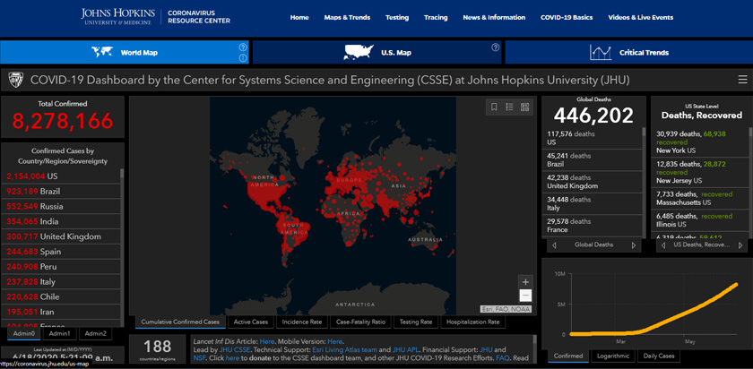 Statistik Johns Hopkins University menunjukkan jumlah kumulatif kematian global kini lebih 446,000 kes.