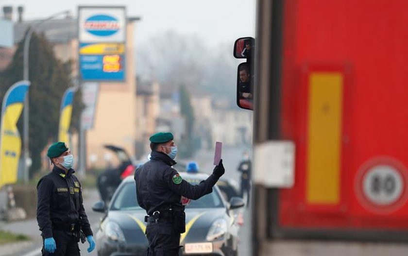 Polis telah mengawal pusat pemeriksaan di sekitar bandar-bandar yang dikuarantin di utara Itali, pada Isnin.
