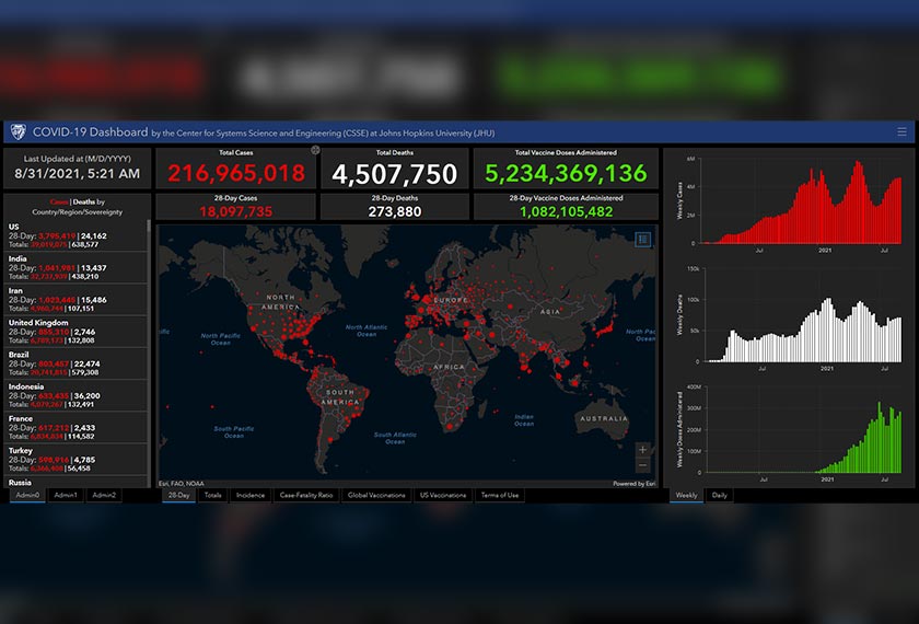 JUMLAH kumulatif kes positif COVID-19 seluruh dunia ketika ini menghampiri 217 juta, berikutan lebih ratusan ribu kes baharu dikesan dalam tempoh 24 jam lepas.