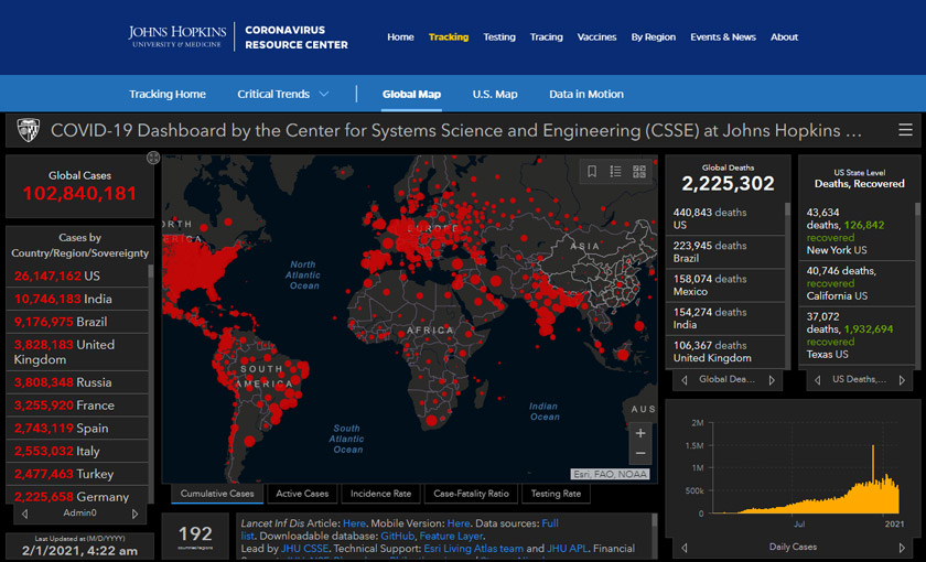 Ia berikutan lebih ratusan ribu kes baharu dikesan dalam tempoh 24 jam lepas, sekali gus menjadikan kes kumulatif global kini berjumlah 102,840,181.