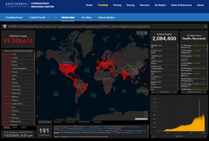 Ia berikutan lebih ratusan ribu kes baharu dikesan dalam tempoh 24 jam lepas, sekali gus menjadikan kes kumulatif global sebanyak 97,283,614.