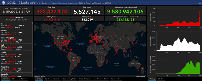 JUMLAH kumulatif kes positif COVID-19 global kini melebihi 322 juta, berikutan pertambahan lebih 2.82 juta kes dalam tempoh 24 jam yang lepas.