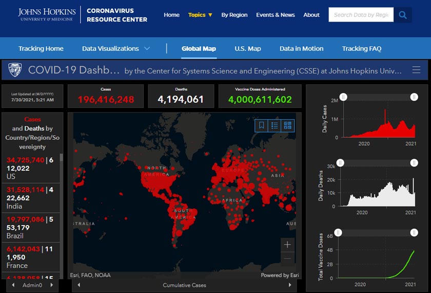 Data terbaharu Johns Hopkins University menunjukkan Amerika Syarikat masih kekal negara paling terjejas dengan lebih 34.72 juta kes.