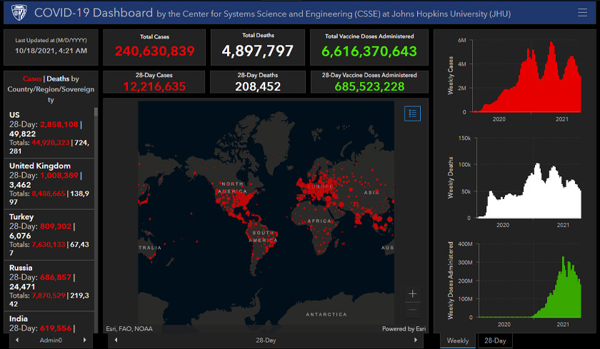 Berdasarkan data Johns Hopkins University, Amerika Syarikat kekal merekodkan jumlah kematian tertinggi melebihi 724,000 kes.