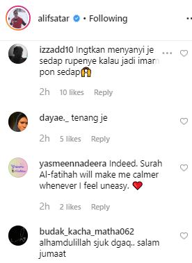 Menerusi perkongsian tersebut, ruangan komen Alif rata-rata dihujani dengan coretan peminatnya amat mengagumi kemahiran dan kemerduan suara penyanyi berkenaan.