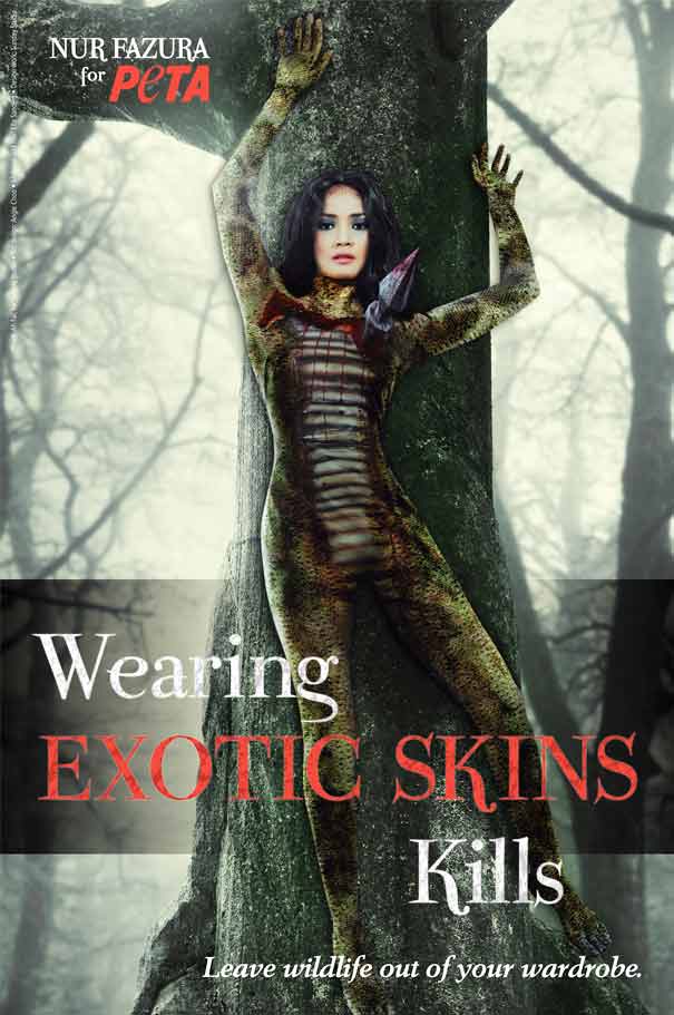Dengan mengenakan pakaian lekap badan menyerupai kulit ular bersebelahan dengan slogan “tinggalkan haiwan liar dari almari anda”, pelakon, pengacara TV dan VJ dari Malaysia menjadi muka baru bagi PETA.