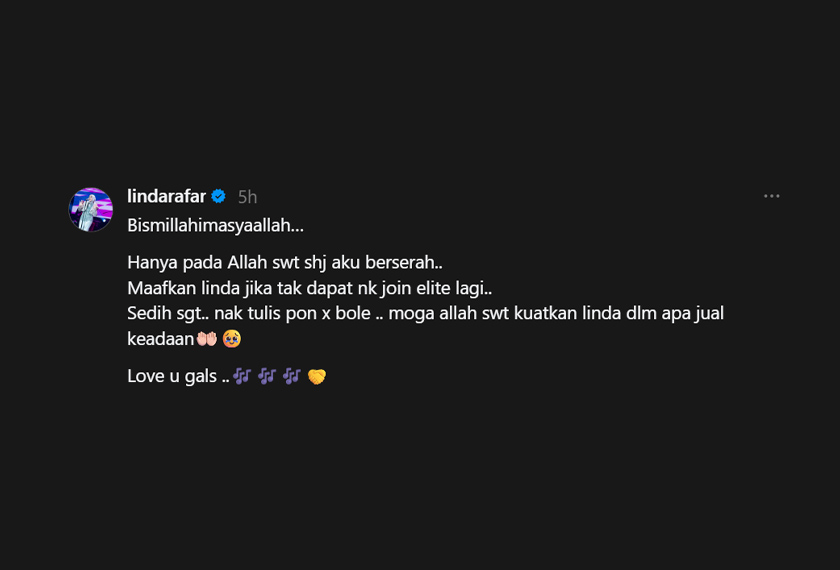- Linda Rafar mengumumkan penarikan diri daripada kumpulan Elite menerusi luahan emosi di platform Thread, sebulan selepas menyertai konsert Elite Live 25.