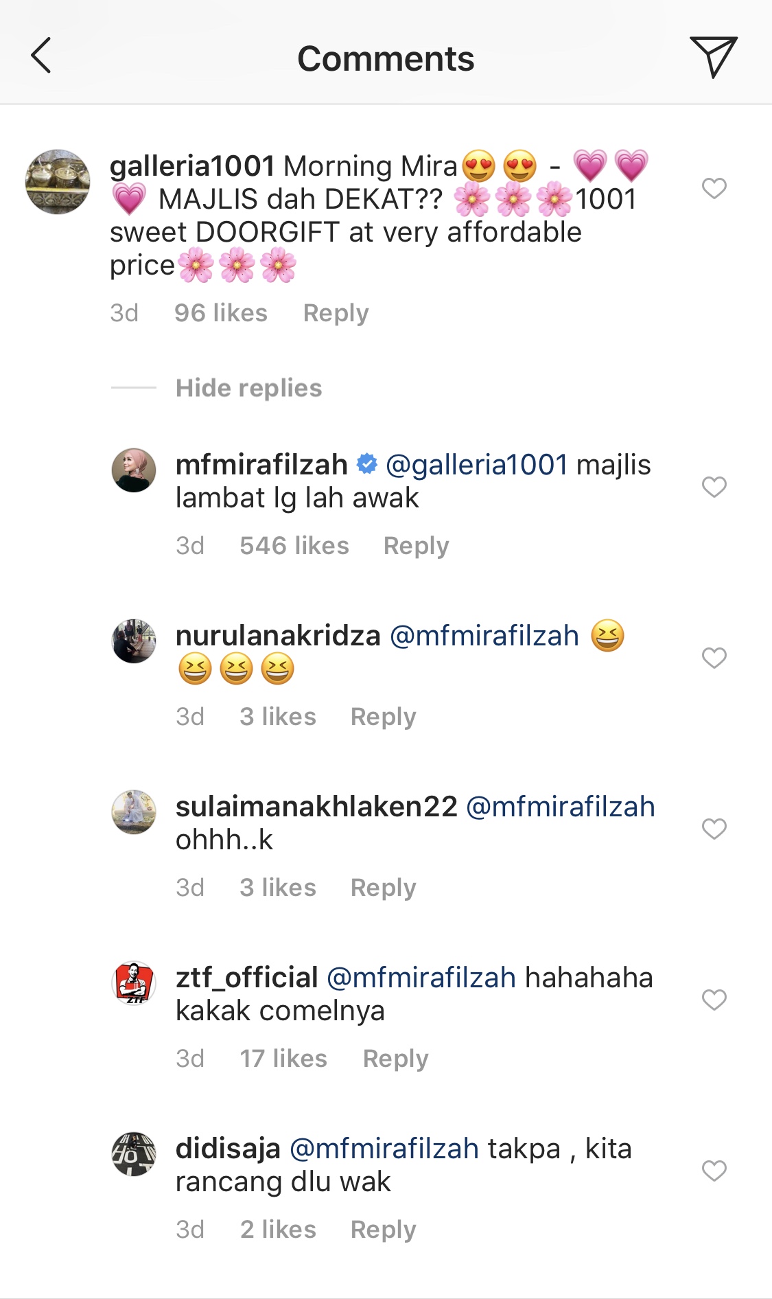 Menerusi ruangan komen salah satu entri yang dimuat naik oleh Mira, pelakon itu didekati oleh sebuah akaun Instagram yang menjual 'doorgift' untuk majlis perkahwinan.