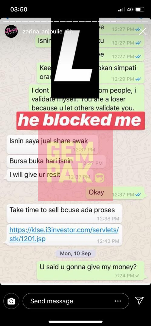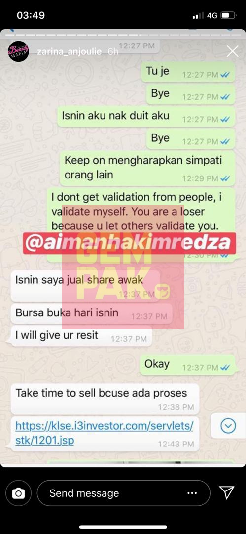 Menerusi Instastories akaun Instagram peribadinya, Zarina menyiarkan bukti perbualan Whatsapp antara Fathia dan Aiman berhubung isu hutang.