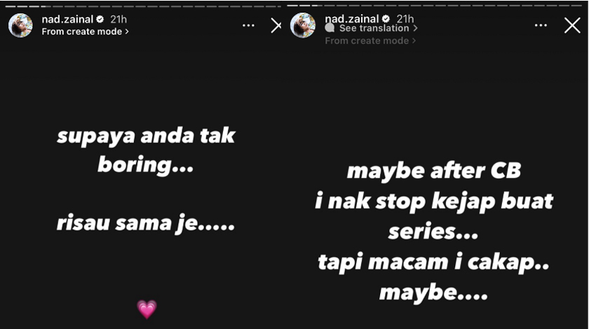 PELAKON popular Nad Zainal baru-baru ini memuat naik satu posting di Instagram Stories miliknya dengan menulis bakal berehat seketika dalam penggambaran drama bersiri.