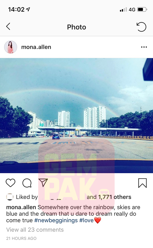 "Somewhere over the rainbow, skies are blue and the dream that you dare to dream really do come true #newbegginings #love," tulis Mona.
