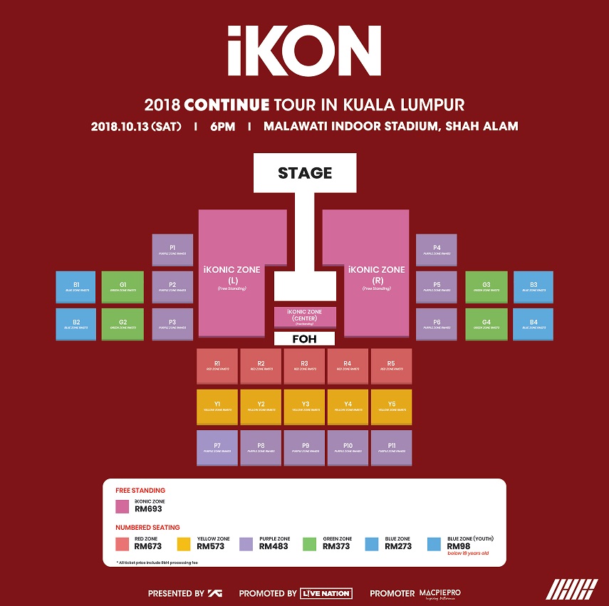 Tiket untuk setiap konsert berharga RM693 (Zon IKONIC/INNER CIRCLE), RM673 (Zon Merah), RM573 (Zon Kuning), RM483 (Zon Ungu), RM373 (Zon Hijau) dan RM273 (Zon Biru).