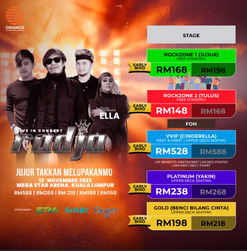 Tiket-tiket yang dijual berharga RM168 (Rockzone 1-Jujur), RM148 (Rockzone 2-Tulus), RM528 (VVIP-Cinderella), RM238 (Platinum-Yakin) dan RM198 (Gold-Benci Bilang Cinta) boleh didapati di ticket2u.com.my. -Gempak