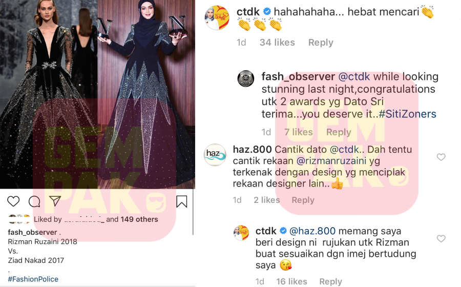 "Cantik Datuk @ctdk. Dan tentu cantik rekaan @rizmanruzaini yang terkenal dengan design yang menciplak rekaan designer lain," tulisnya.