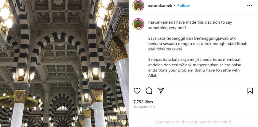 “Sekali lagi saya memohon anda semua menghormati ruang kami. Kami sedang melalui waktu sukar. Doakan semoga semoga Allah permudahkan segala urusan kami berdua,” coretnya.