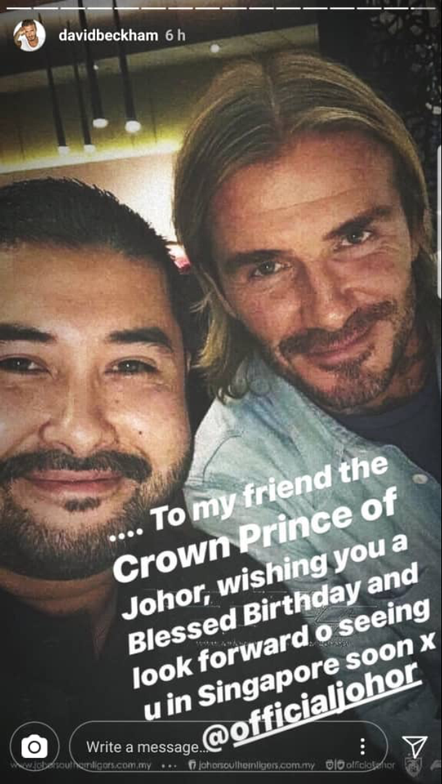 "To my friend the Crown Prince of Johor, wishing you a Blessed Birthday and look forward to seeing you in Singapore soon," tulis Beckham.