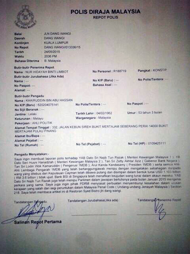 Salinan laporan polis yang dibuat Khairuddin terhadap beberapa pemimpin negara dan ahli lembaga pengarah 1MDB - Sumber gambar Khairuddin