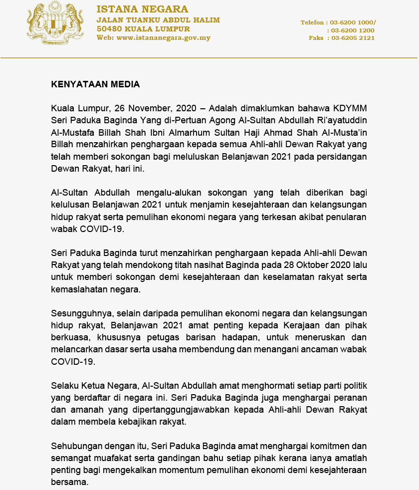 KUALA LUMPUR:Seri Paduka Baginda Yang di-Pertuan Agong Al-Sultan Abdullah Ri’ayatuddin Al-Mustafa Billah Shah Ibni Almarhum Sultan Haji Ahmad Shah Al-Musta’in Billah hari ini menzahirkan penghargaan kepada semua Ahli-ahli Dewan Rakyat yang telah memberi sokongan bagi meluluskan Belanjawan 2021 pada persidangan Dewan Rakyat,hari ini.
