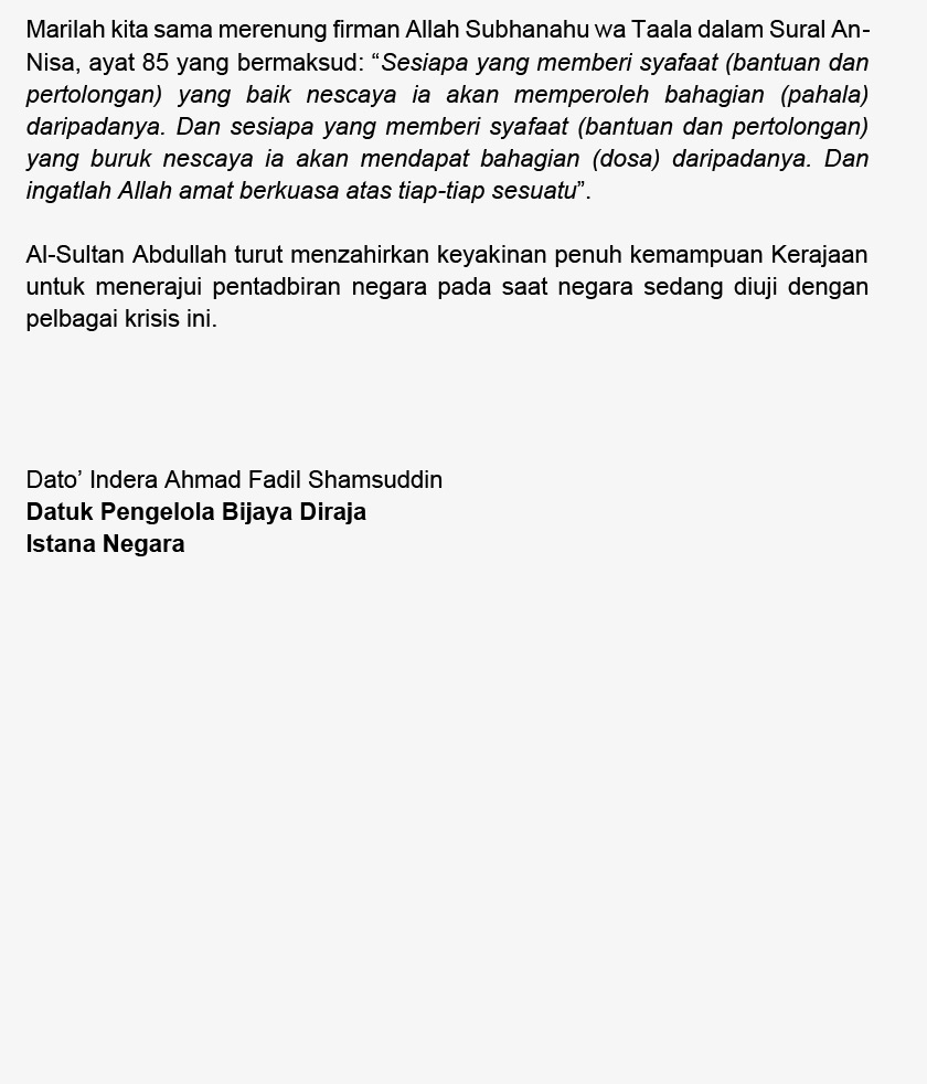 "Selaku Ketua Negara, Al-Sultan Abdullah amat menghormati setiap parti politik yang berdaftar di negara ini. Seri Paduka Baginda juga menghargai peranan dan amanah yang dipertanggungjawabkan kepada Ahli-ahli Dewan Rakyat dalam membela kebajikan rakyat," kata kenyataan lagi.