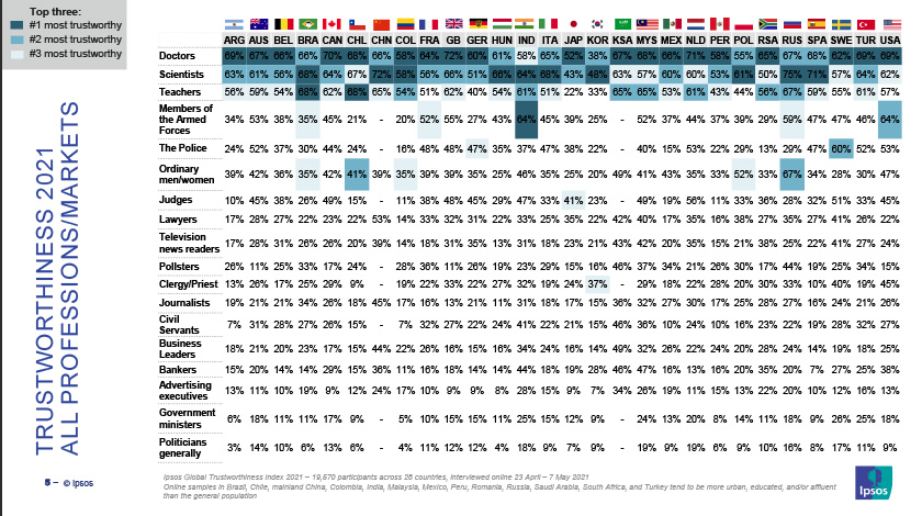 Sementara itu, tinjauan yang sama mendapati profesion kedoktoran mendapat nilai kebolehpercayaan tertinggi dengan 68 peratus rakyat Malaysia menganggap mereka boleh dipercayai, guru 65 peratus, ahli sains (57 peratus), angkatan tentera (52 peratus), hakim (49 peratus) , pembaca berita (42 peratus), polis dan peguam masing-masing 40 peratus serta wartawan (32 peratus).