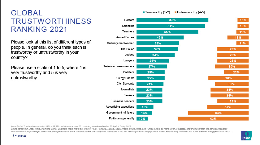 Malah berdasarkan tinjauan global pula, masyarakat dunia turut mengakui profesion sebagai ahli politik tidak boleh dipercayai dengan nilai kepercayaan antara tiga hingga 19 peratus, di kedudukan paling bawah.