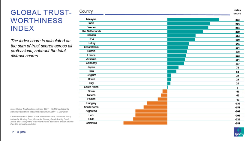 Perkara itu didedahkan menerusi kajian Trust in Professions yang dijalankan firma penyelidikan pasaran Ipsos Sdn Bhd (Ipsos) dari 23 April hingga 7 Mei lalu, membabitkan 19,570 responden dari 28 buah negara.