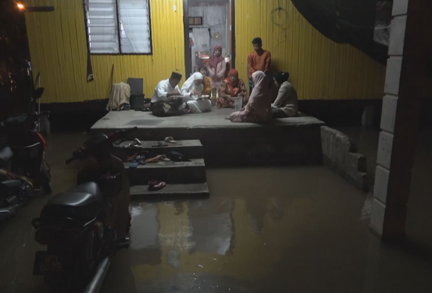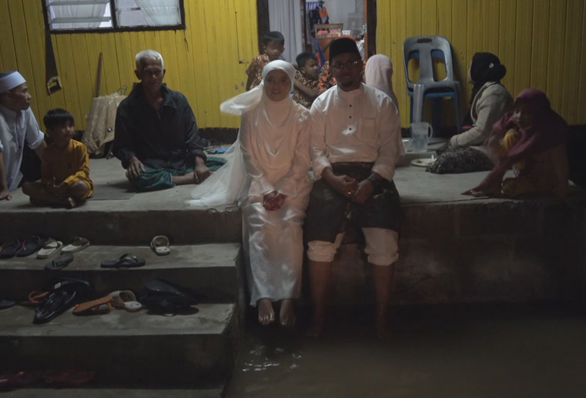 “Tapi tak sangka pula air (naik). Air penuh depan tangga ni. Setakat ni, dua tangga tu air dah (naik) melimpah. Tapi Alhamdulillah syukur... meriah juga. Orang kata pengantin dalam banjir.
