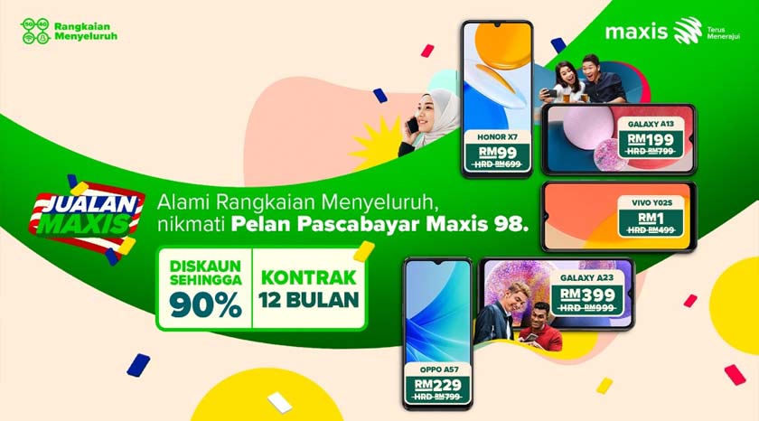 - Diskaun sehingga 90 peratus dan kontrak 12 bulan pada rangkaian luas telefon pintar dengan Maxis Postpaid 98.