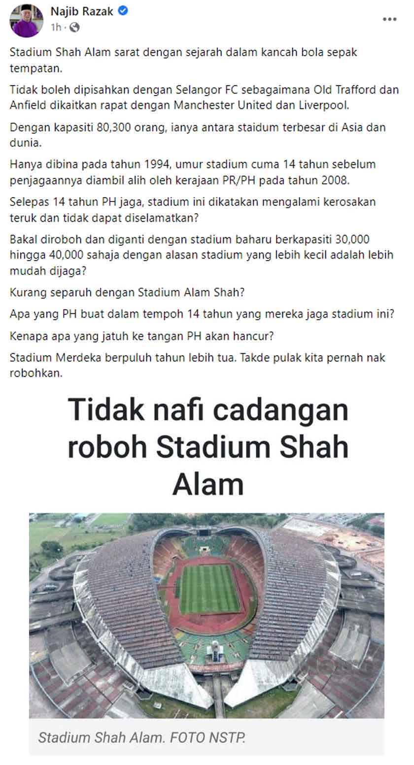 KUALA LUMPUR: Datuk Seri Najib Tun Razak mempersoalkan tindakan Kerajaan Negeri Selangor yang dilapor mempertimbang kemungkinan merobohkan Stadium Shah Alam.