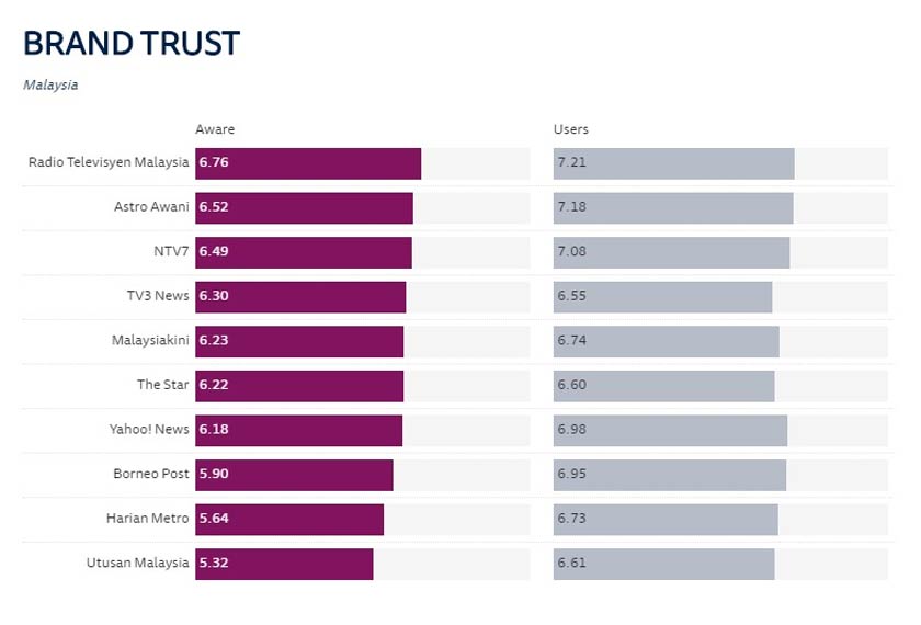 KAJIAN tahunan oleh Institut Kajian Berita Digital Reuters baru-baru ini mendedahkan senarai jenama berita yang paling dipercayai bagi tahun 2019.