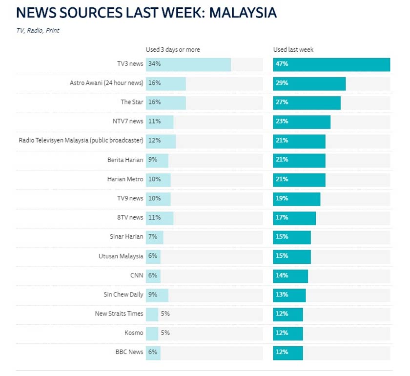 Menurut laporan itu, berita dalam talian merupakan sumber paling dominan dari 2017 hingga 2019, diikuti media sosial, televisyen dan akhbar.