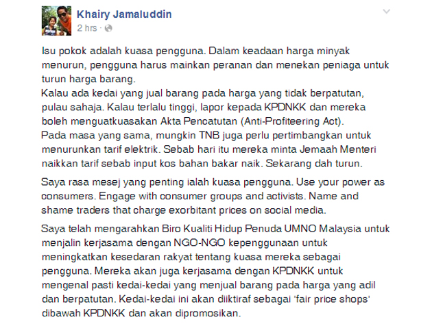 Status terbaharu Facebook Khairy yang mahu pengguna menggunakan kuasa pembeli dan memberi tekanan kepada peniaga yang masih berdegil untuk menurunkan harga barang - Gambar Facebook Khairy
