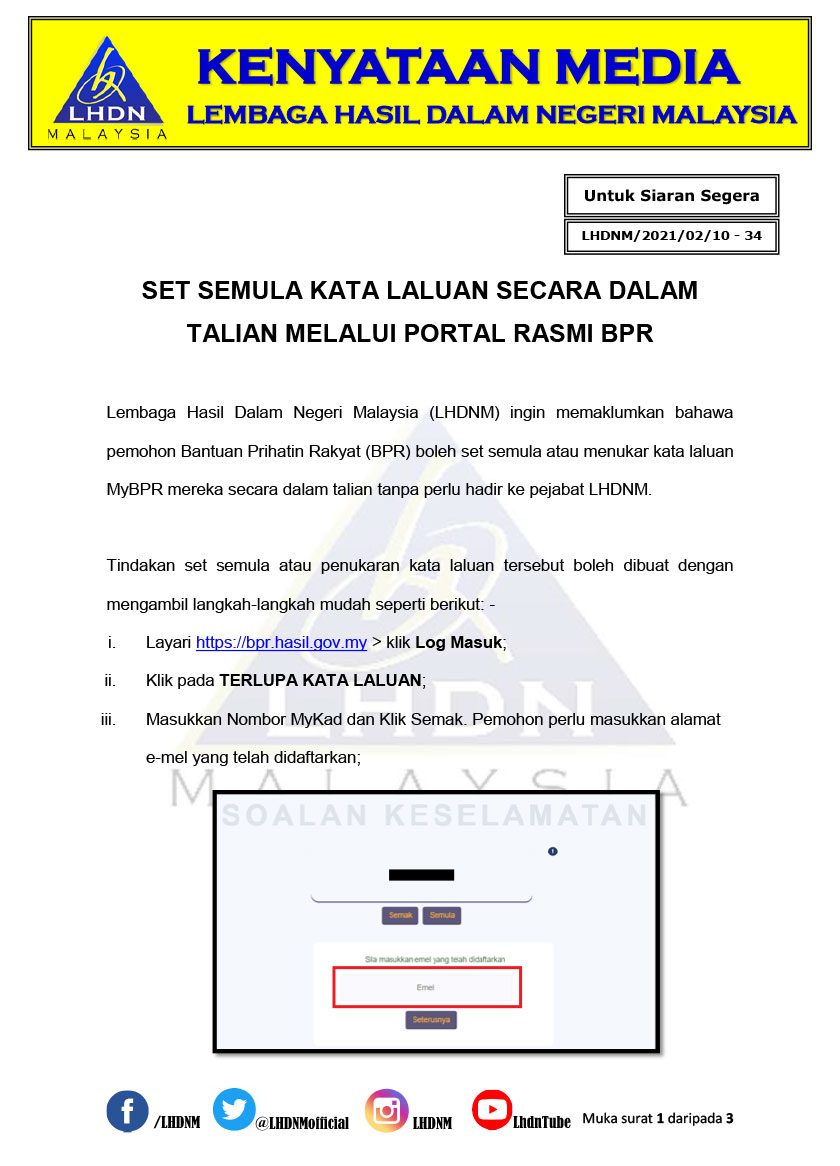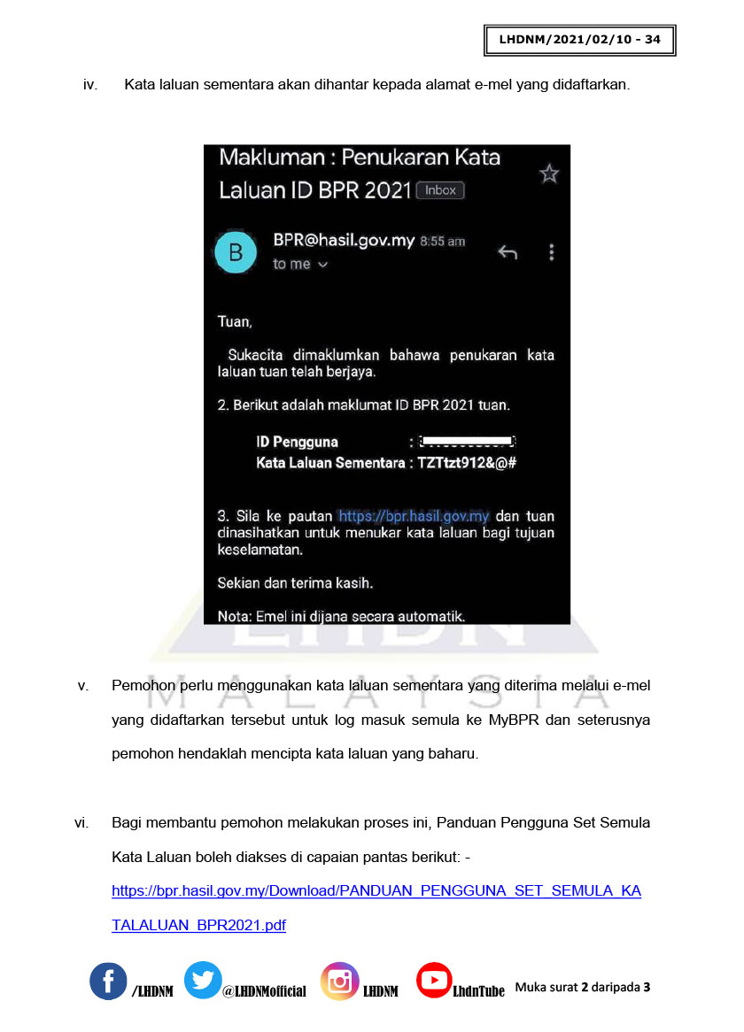 LHDN memaklumkan, penukaran kata laluan itu boleh dibuat di laman web BPR dengan menekan 'terlupa kata laluan', memasukkan nombor kad pengenalan dan akhirnya menekan 'semak'.