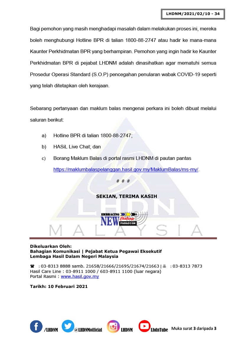 Namun demikian LHDN berkata, bagi pemohon yang masih menghadapi masalah dalam melakukan proses ini, mereka boleh menghubungi Hotline BPR di talian 1800-88-2747 atau hadir ke mana-mana kaunter perkhidmatan BPR yang berhampiran.