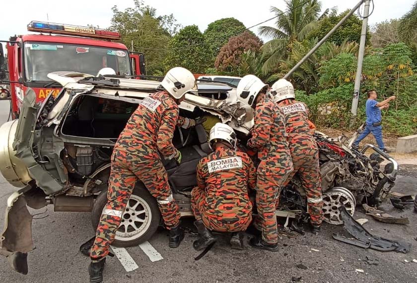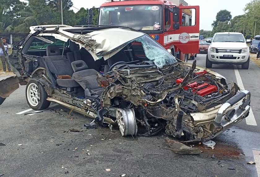 Akibat perlanggaran itu, kereta dipandu mangsa berpusing dan melintang di laluan bertentangan, manakala lori tersebut terbalik.
