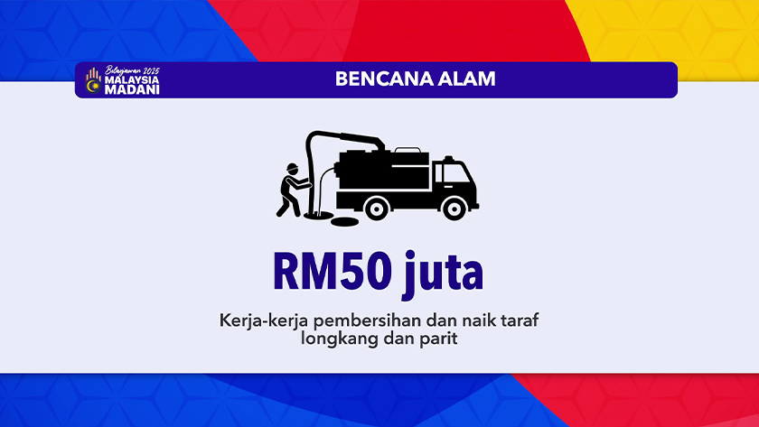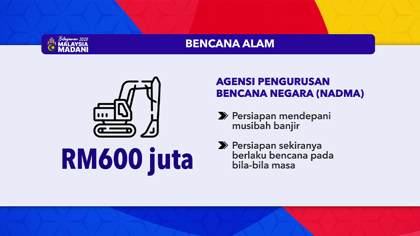 Selain itu, peruntukan hampir RM600 juta disediakan untuk Agensi Pengurusan Bencana Negara (NADMA) sebagai persiapan mendepani musibah banjir, termasuk lebih RM 300 juta yang telah disediakan untuk persiapan sekiranya berlaku bencana pada bila-bila masa.