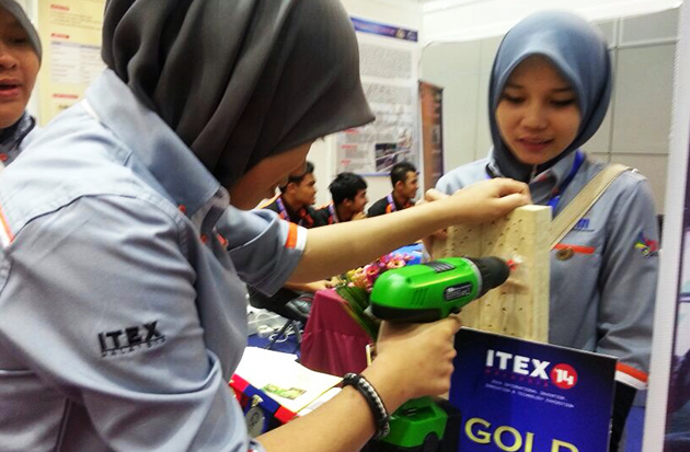 Pada masa sama, pelajar Institut Kemahiran di bawah Jabatan Tenaga Manusia turut menarik perhatian dengan ciptaan produk plastik penangkap habuk ketika menggerudi.