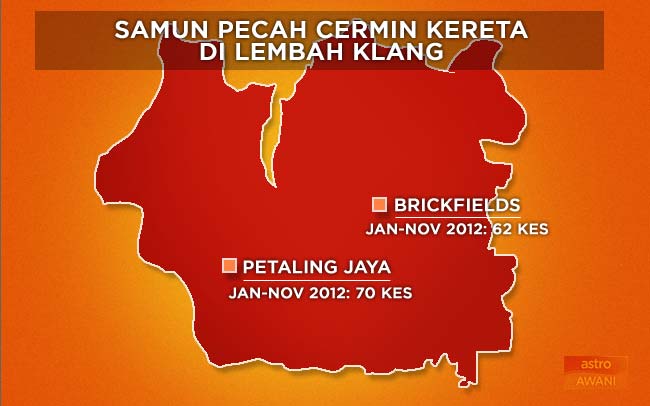 “Sepanjang tempoh Januari hingga November 2012, sebanyak 133 kes jenayah samun pecah cermin kereta direkodkan. Kecuali Putrajaya yang tiada mencatatkan perlakuan jenayah ini, daerah-daerah seperti Sentul, Cheras dan Dang Wangi banyak merekodkan jenayah seperti ini.