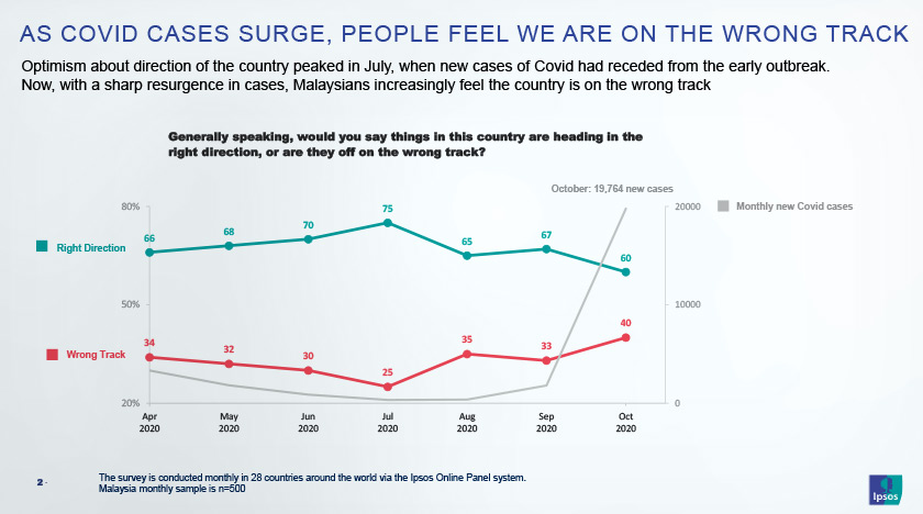 Menurut kajian IPSOS Malaysia, bertajuk “What Worries Malaysia”, jumlah peratusan responden yang rasa negara berada di landasan yang salah meningkat kepada 40 peratus.