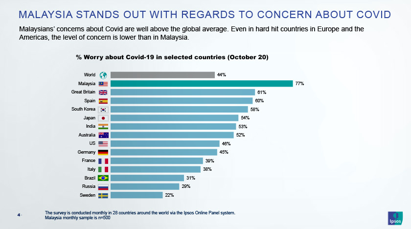 Berbanding penanda aras kerisauan tentang COVID-19 global pada 44 peratus pada Oktober, warga Malaysia berada jauh lebih risau pada 77 peratus.