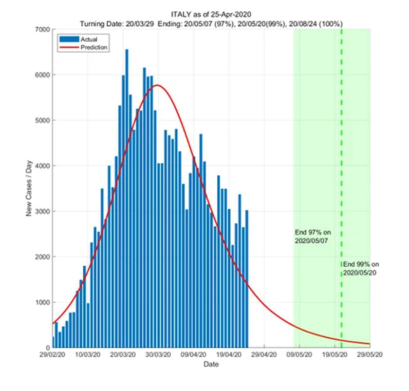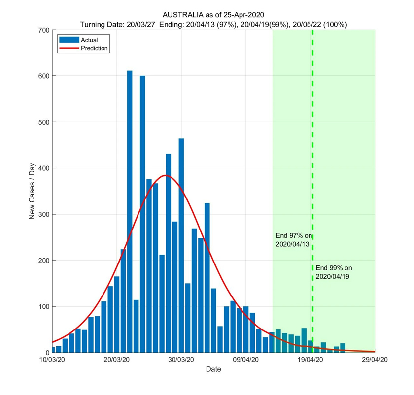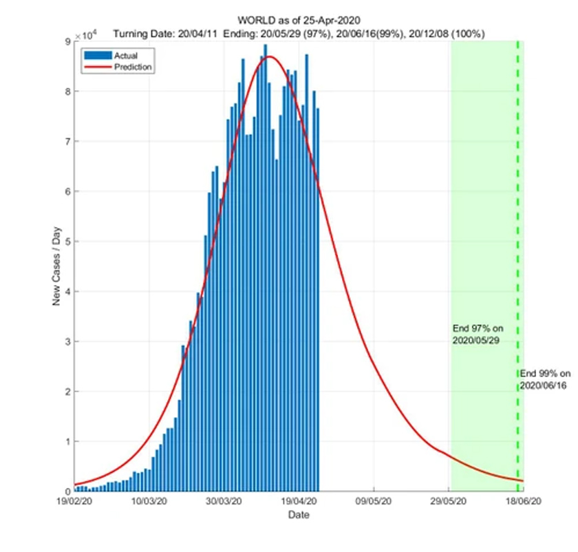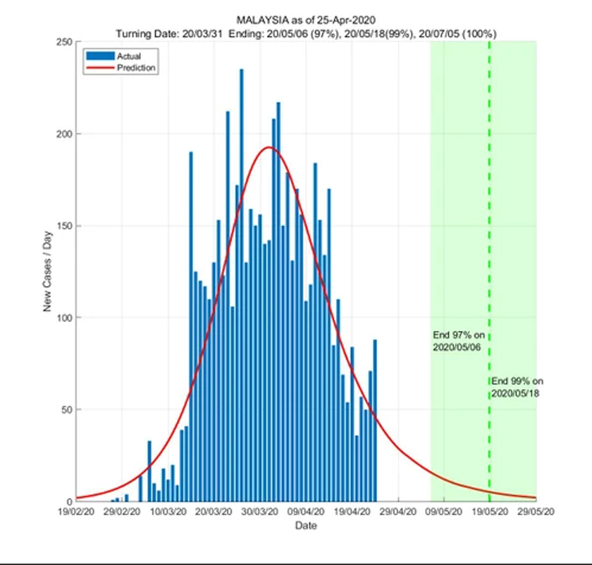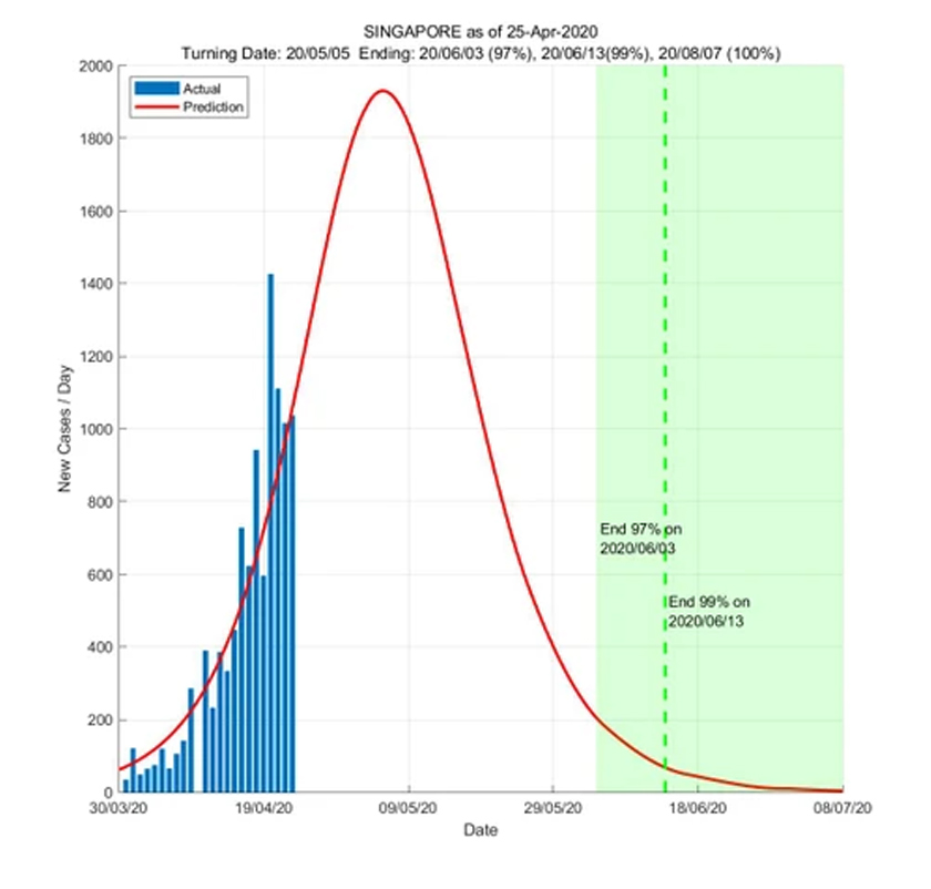 Virus tersebut diramalkan berakhir di Singapura pada 4 Jun ini dengan 97 peratus penurunan sementara di Itali pada 7 Mei, Jepun (18 Mei), Indonesia (6 Jun), India (21 Mei), Mesir (19 Mei) dan Filipina (8 Mei).