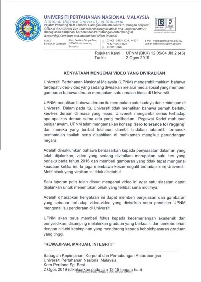 “UPNM menafikan deraan itu merupakan satu budaya dan kebiasaan di universiti.
