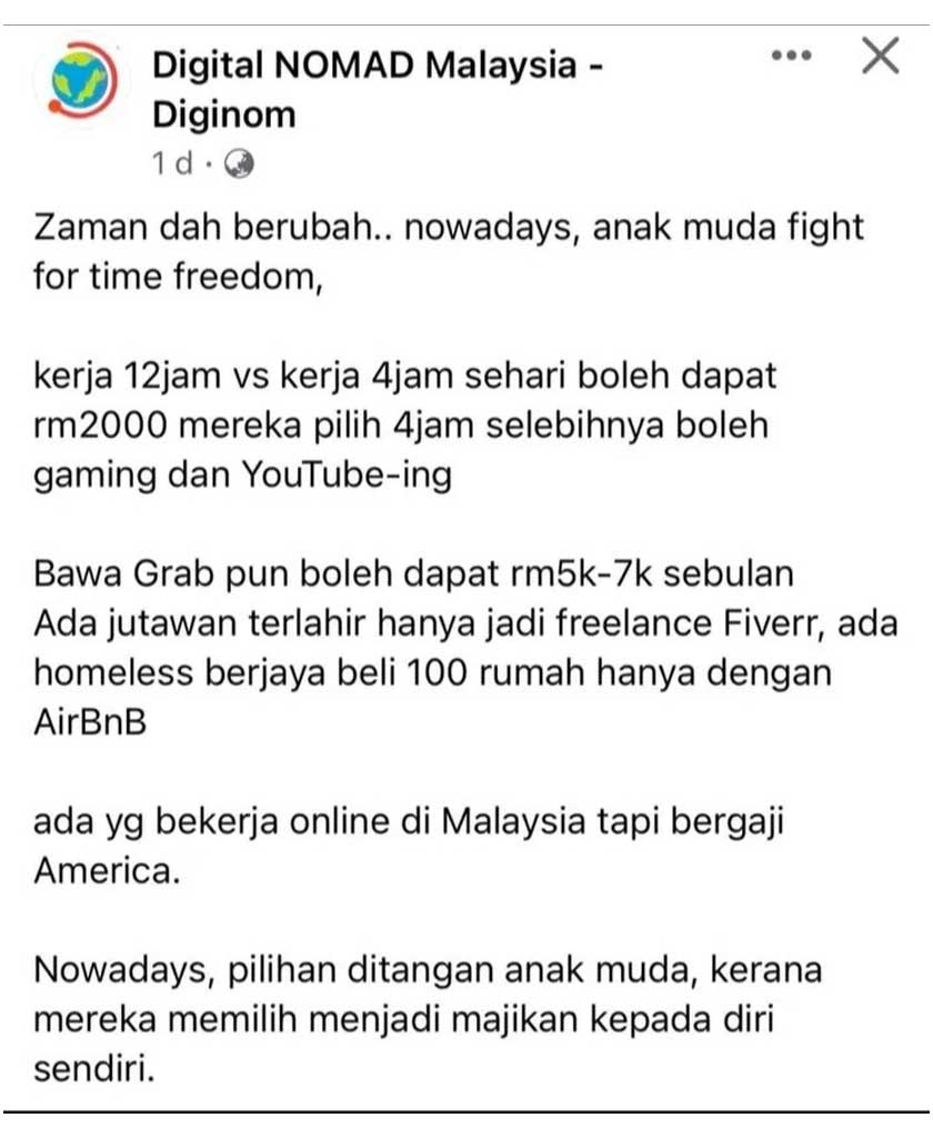 Dalam sebuah tangkap layar di bawah menceritakan bagaimana zaman kini anak muda menginginkan kerja yang kebebasan masa tanpa terikat dengan waktu yang kompleks tetapi gaji yang tidak setimpal serta mereka mahu menjadi majikan kepada diri sendiri.