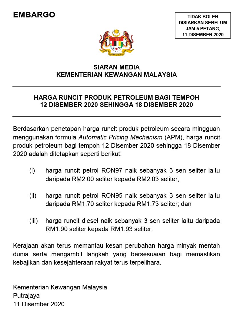 “Kerajaan akan terus memantau kesan perubahan harga minyak mentah dunia serta mengambil langkah yang bersesuaian bagi memastikan kebajikan dan kesejahteraan rakyat terus terpelihara,” kata kementerian itu lagi.