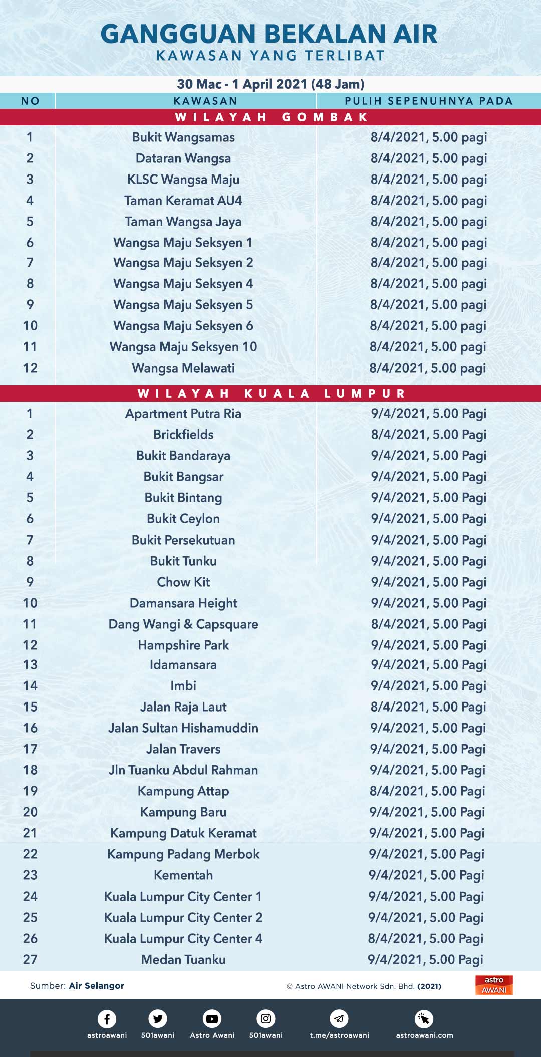 KUALA LUMPUR: Sebanyak 89 kawasan di wilayah Gombak, Kuala Lumpur, Petaling, Klang dan Shah Alam akan mengalami gangguan air berjadual antara 48 hingga 68 jam bermula 30 Mac, dan 6 April depan.