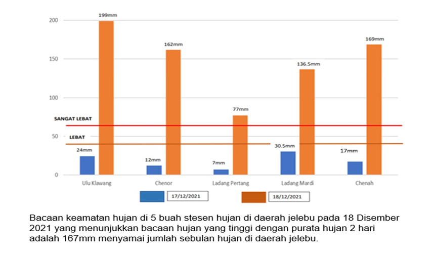 Namun, pada 18 Dis lalu, lima stesen hujan di daerah itu merekodkan taburan hujan yang luar biasa iaitu melebihi 100 mm, sedangkan pada hari sebelumnya, lima stesen terbabit - Ulu Klawang, Chenor, Ladang Pertang, Ladang Institut Penyelidikan dan Kemajuan Pertanian Malaysia (MARDI) Jelebu serta Chennah - mencatatkan paras normal bawah 60 mm.