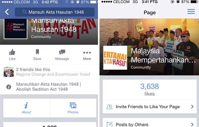 Laman sosial Facebook Gerakan Mansuh Akta Hasutan dan Gerakan Warganegara mempertahankan Akta Hasutan 1948 - Gambar Facebook